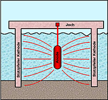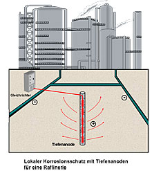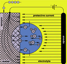 Cathodic protection is a method which reliably protects the metal even at undetected coating holidays. The protective current supplies electrons to the structure which is protected. These electrons cover the electron requirements for the reduction of oxygen which comes into contact with the metal surface. Without cathodic protection, these electrons provide the decomposition of the metal. Thus, the potential of the metal surface is sufficiently reduced to prevent the disassociation of positive ions from the metal. Where formerly an anodic reaction took place, the oxygen is reduced by cathodic reaction. The entire surface of the structure protected is thus transformed into a safe cathode, i.e. the metal is " cathodically " protected.